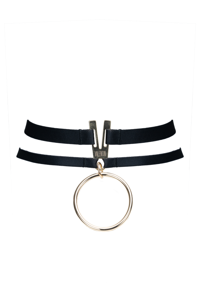 Adam Choker in Onyx. A delicate bondage collar featuring two skinny satin elastic straps and our signature gold hardware. The sleek o-ring is a fashion statement and an anchorpoint to attach restrains and leashes for fetish roleplay. Whether you take the lead or surrender to your lovers' mercy, this accessory is a glamorous must-have for those who dabble in sensuality. This lascivious neck accessory goes with everything — wear our Adam choker with casual attire during the day or dressed up at night.