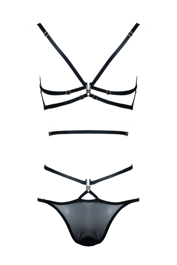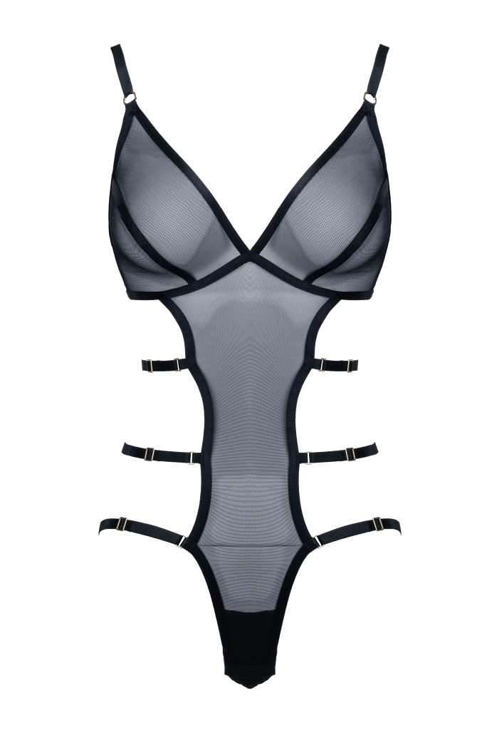 Camille Bodysuit in Onyx. Sheer in all the right places, open in all the right places. Be caged in our harness bodysuit while the fully adjustable soft straps allow you to move freely and be comfortable.