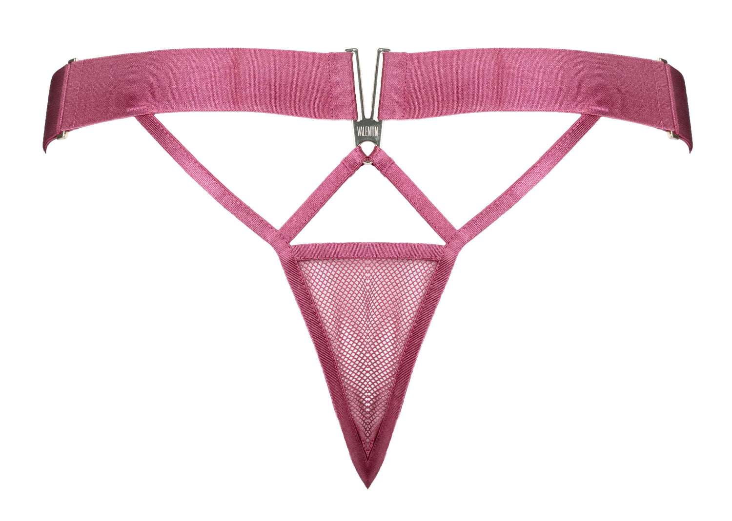 Jezebel Thong in deep blush. A strappy delight in soft open-knit mesh with soft and stretchy wide elastics for a harness waistband. Featuring sassy triangler key-hole cut-outs and our signature golden V hardware on the front and back. Pair with the matching Euphoria Bralette for a luscious and perfect everyday set.