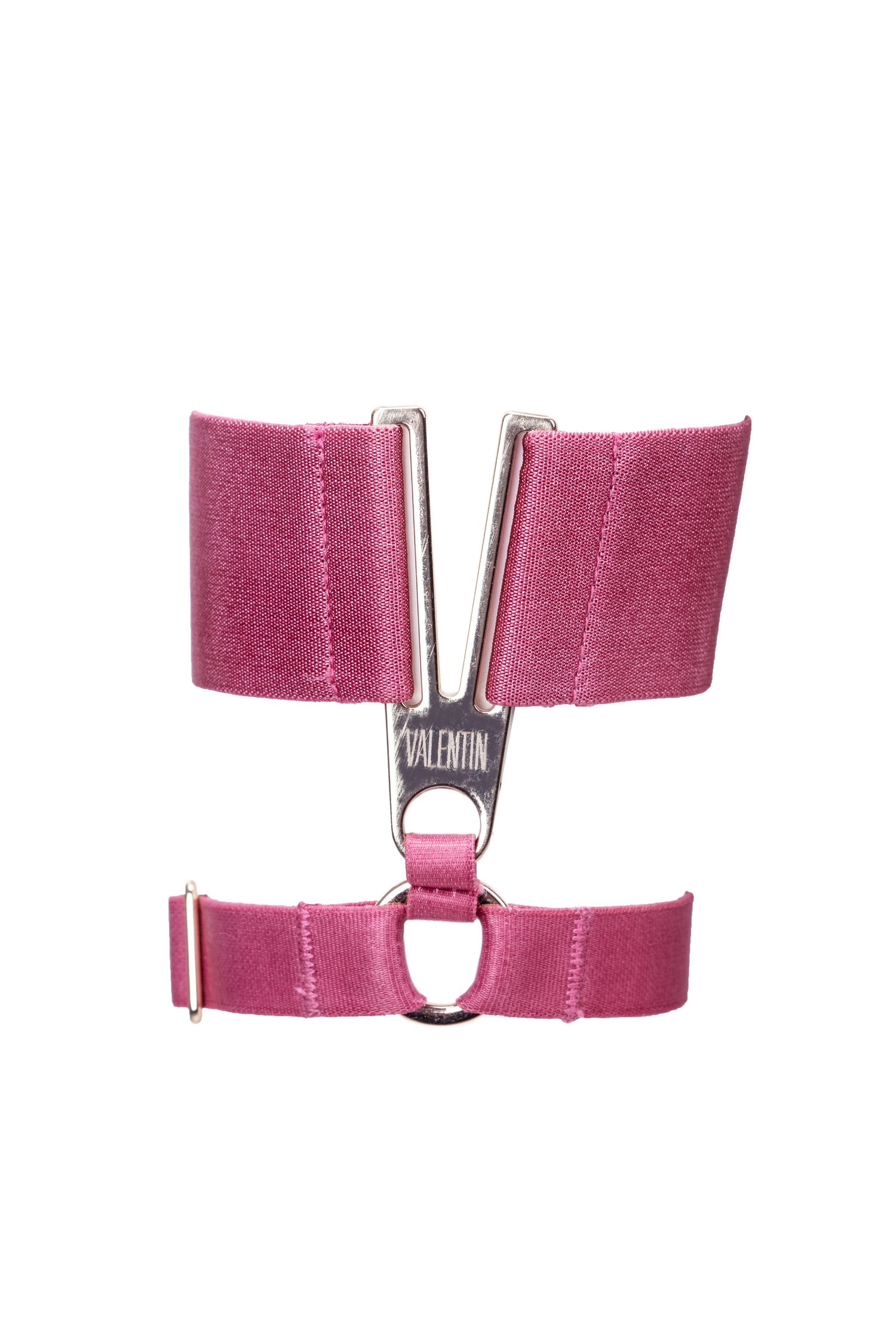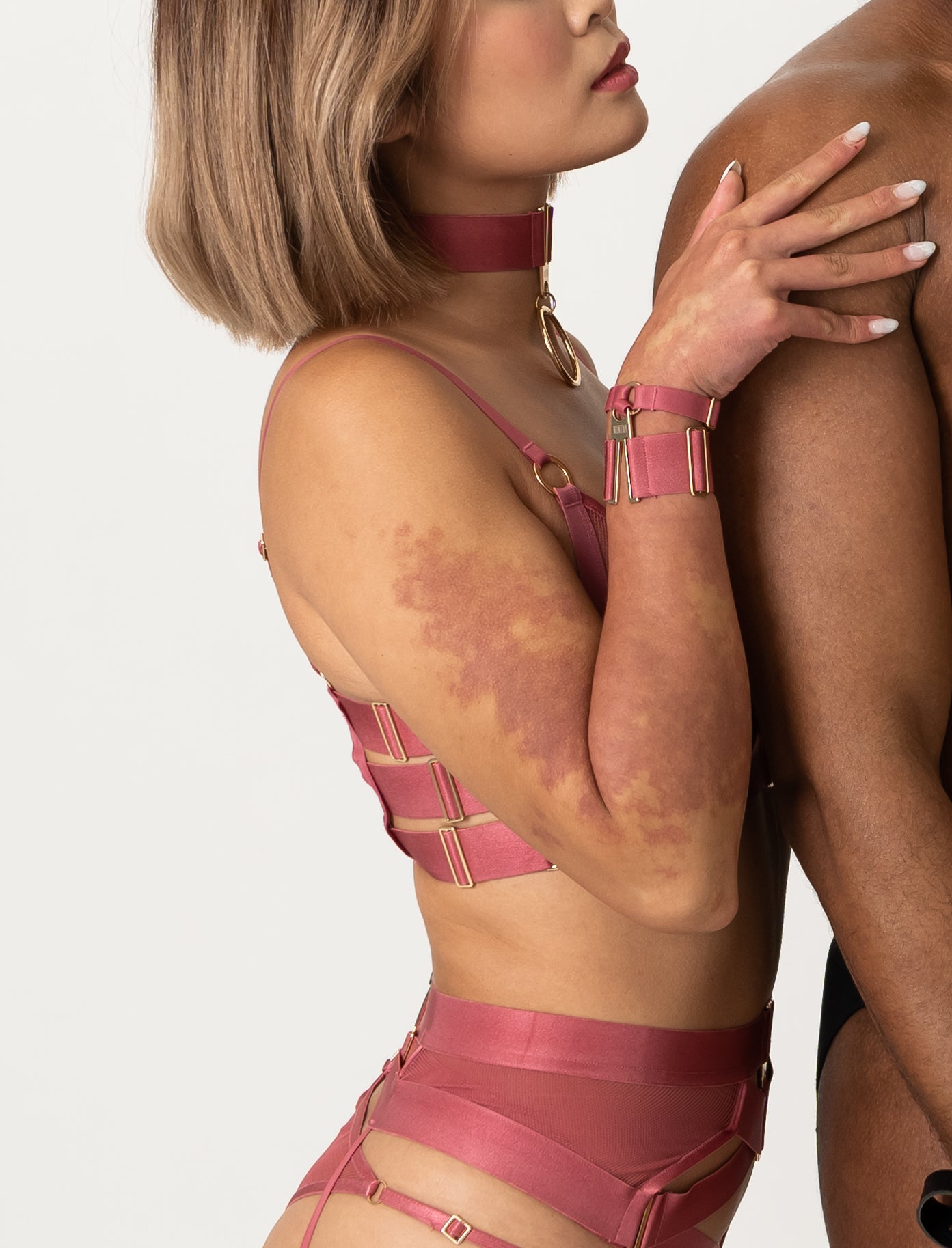 Moxie Handcuffs in deep blush. These kinky satin elastic handcuffs feature our signature golden hardware and are easily incorporated into outerwear in ways that can be both overt or subtle. Pair our luxurious fetish bracelets with any piece of the Coveted Seduction collection for a provocative and playful set.