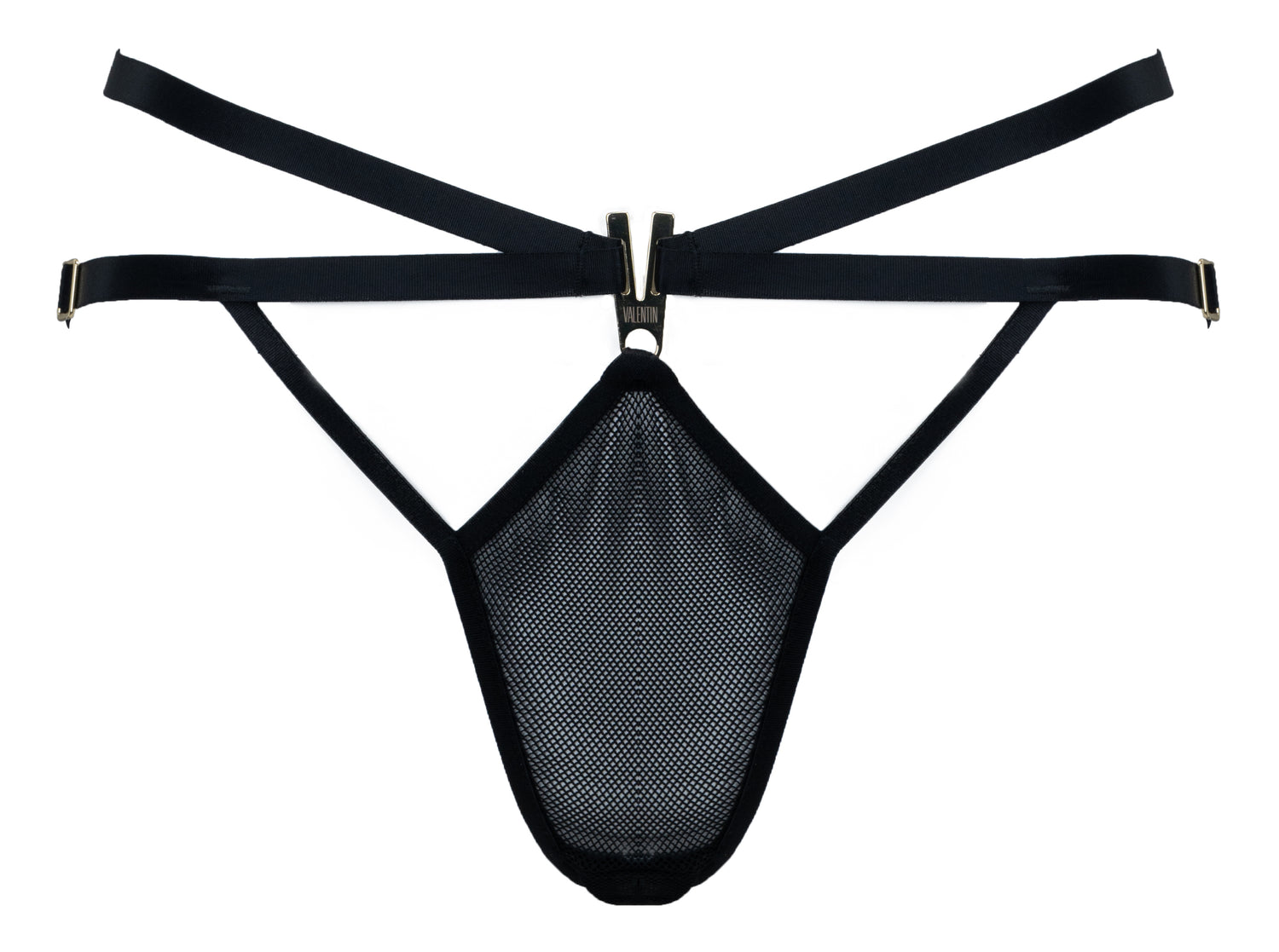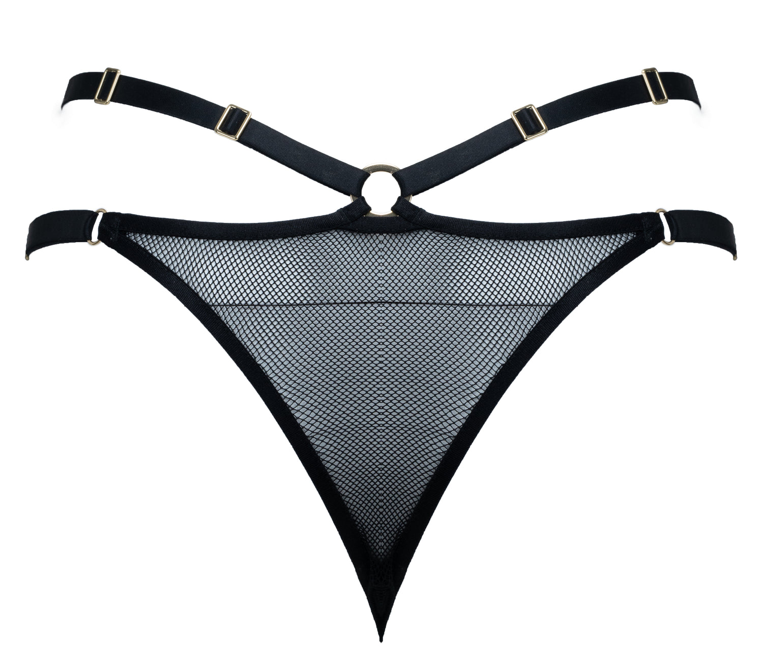 Forbidden Fruit Thong in Onyx. This erotic harness bottom will ravish and frame your curves in the most exquisite way. This seductive thong is crafted with adjustable soft elastics and beautiful diamond mesh. Provocative and inviting if you wish; featuring open keyhole cut-out design on the front, while silk elastic straps at the gusset allow easy access. Elevate your erotic play or wear the no show thong underneath your everyday outfit as your sexy little secret.
